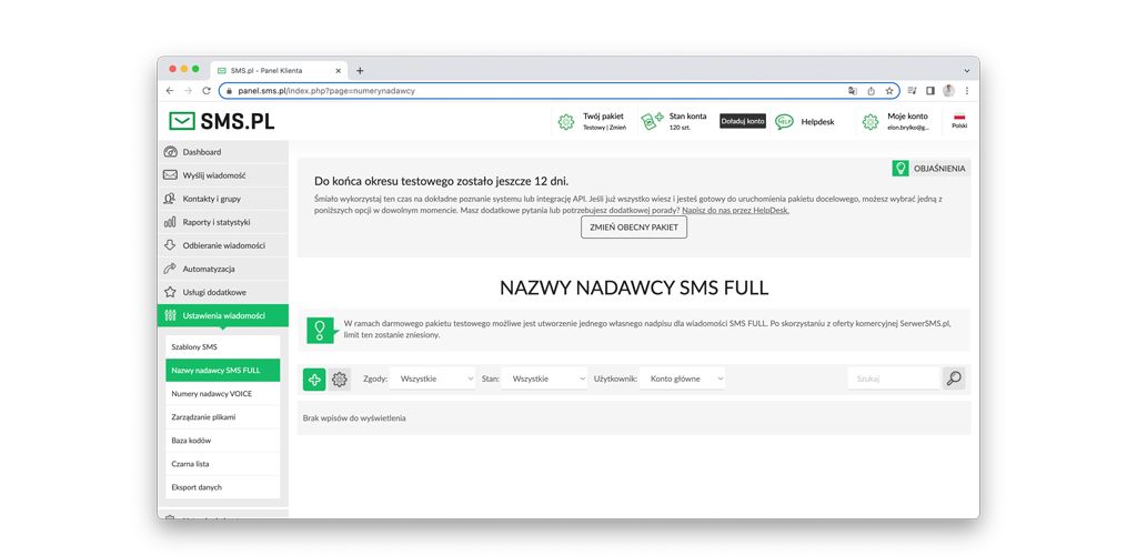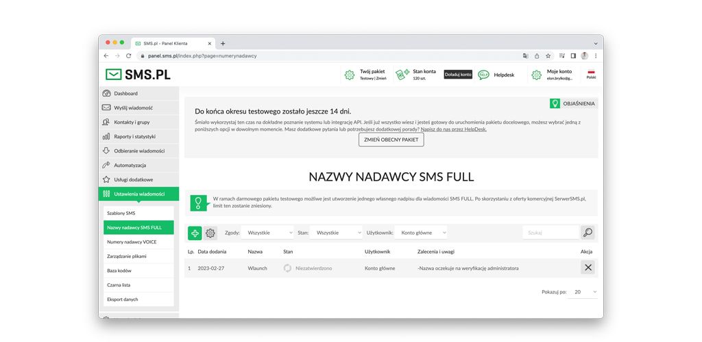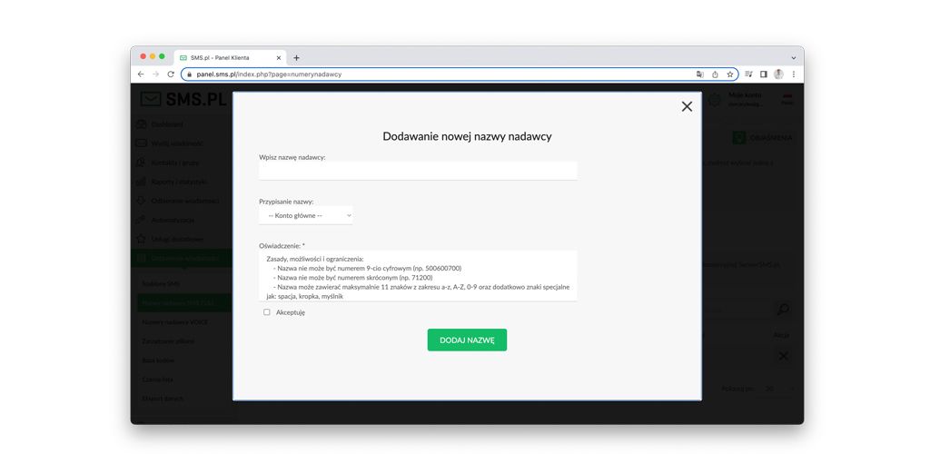 In the side menu, select Message Settings > SMS FULL Sender Names, and click +.