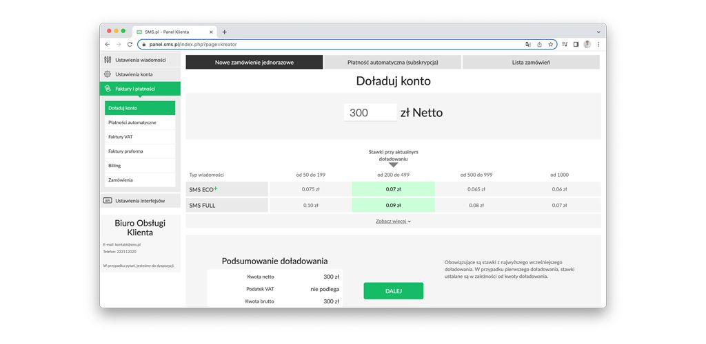 Enter the top-up amount (Note: the price of each SMS depends on the amount) and click NEXT.