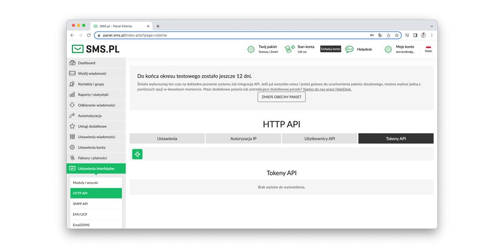 After completing the payment, select Interface Settings > HTTP API in the side menu. Click API Tokens and then +.