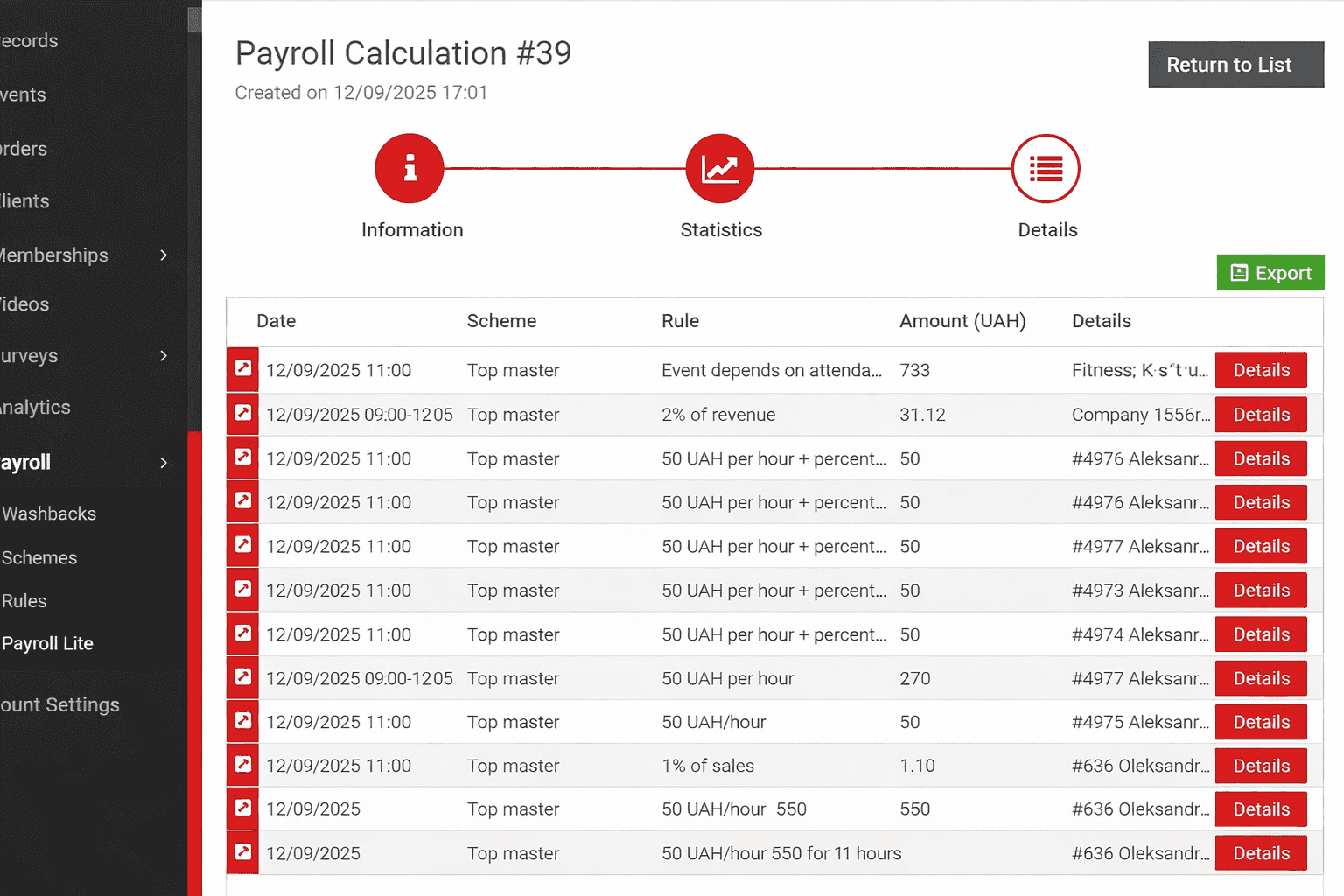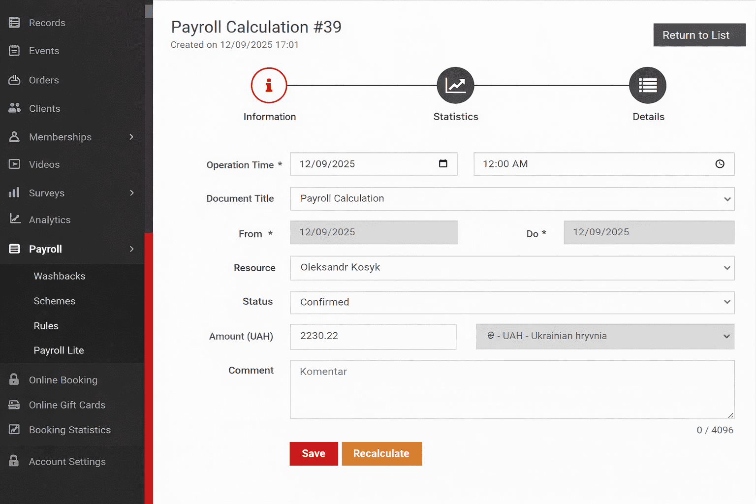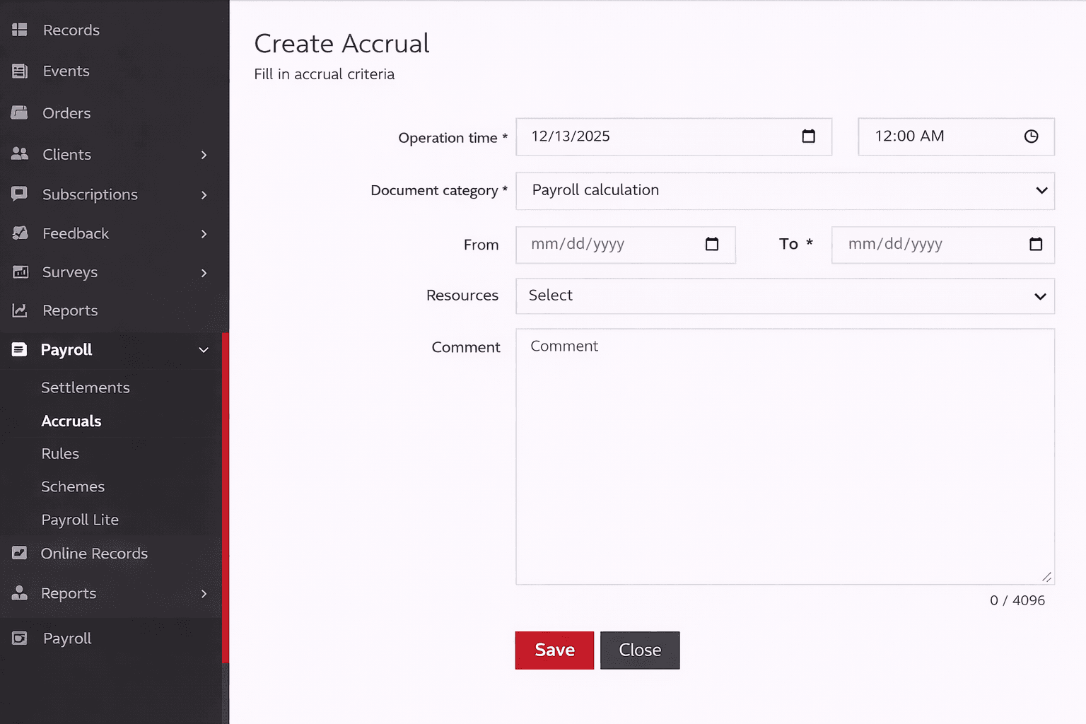 The Accruals and operations section is designed for viewing all accruals and payments, as well as for creating documents that affect employees' salary balance.