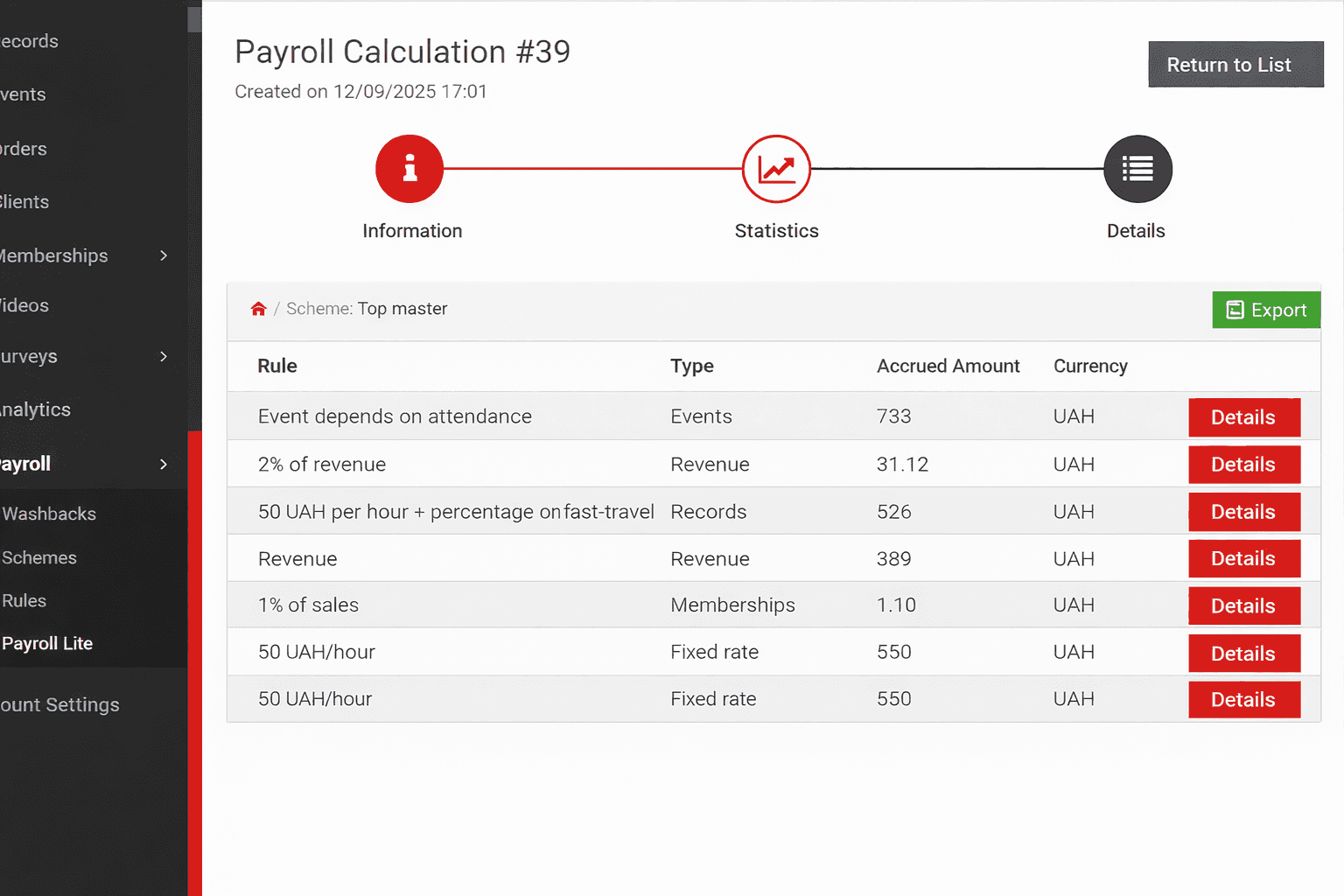 For the accrual document, statistics are displayed for each rule included in the scheme: