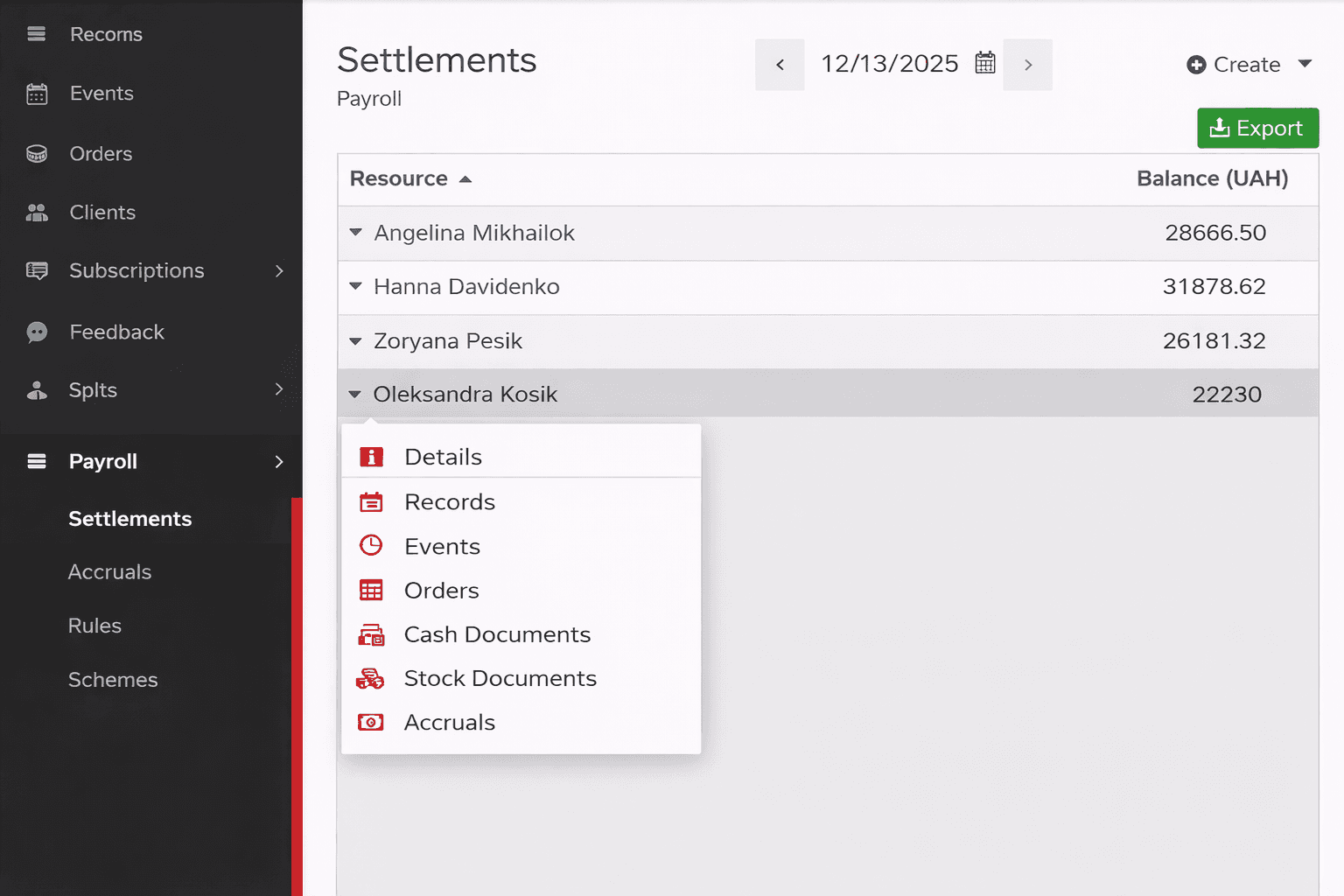 Розділ Взаєморозрахунки призначений для контролю балансу заробітної плати всіх працівників компанії. Цей екран відображає поточний фінансовий стан кожного спеціаліста та дозволяє швидко виконувати основні зарплатні дії без переходу в інші розділи.