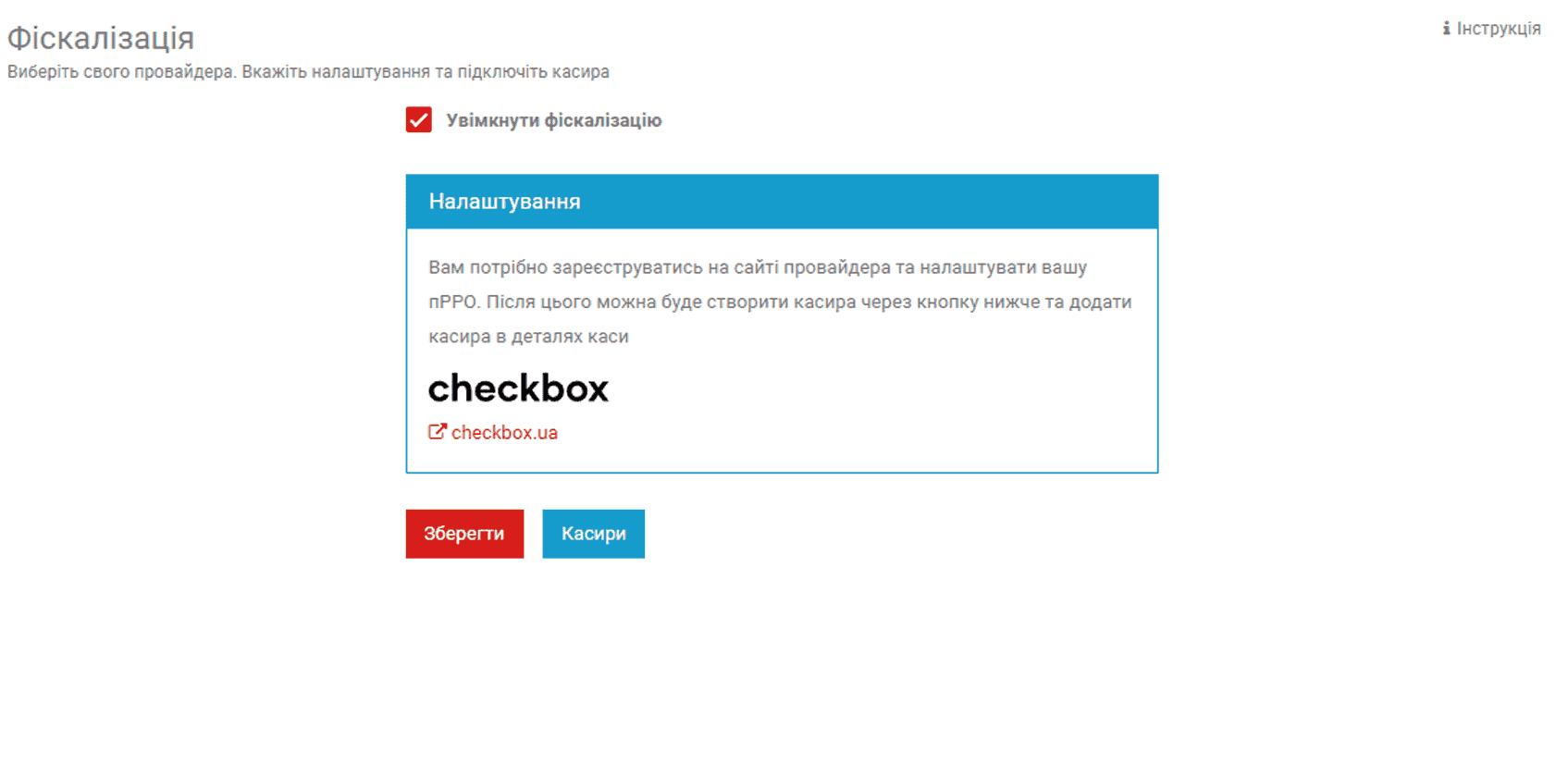 - Активуйте фіскалізацію на сторінці Каси - Фіскалізація,