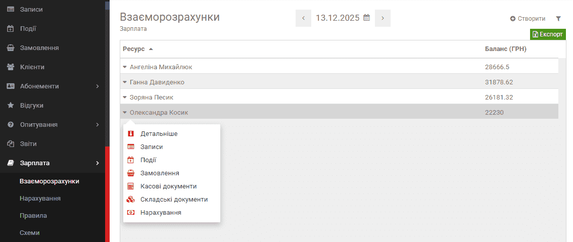 Розділ Взаєморозрахунки призначений для контролю балансу заробітної плати всіх працівників компанії. Цей екран відображає поточний фінансовий стан кожного спеціаліста та дозволяє швидко виконувати основні зарплатні дії без переходу в інші розділи.
